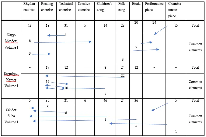 The content categories of publications detailed above were determined based on primary characteristic. However, it is often the case that an exercise or piece also has a secondary (or even tertiary) characteristic, which mostly occurs for pieces and exercises for beginners. The most frequent examples are reading exercises based on children’s songs and reading exercises also constituting technical exercises. The reason is the difference in the author’s concept about the extent of making the content explicit or implicit. The research of overlapping categories requires the above-mentioned scholarly and professional intuitions the most. Overlapping content is present in all volumes but with a gradually declining frequency. Since these aspects could only be described (or illustrated) for all volumes in an overly complicated and not very transparent way, I present the respective results for the first volume of each series.