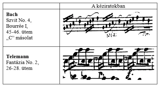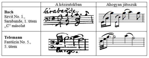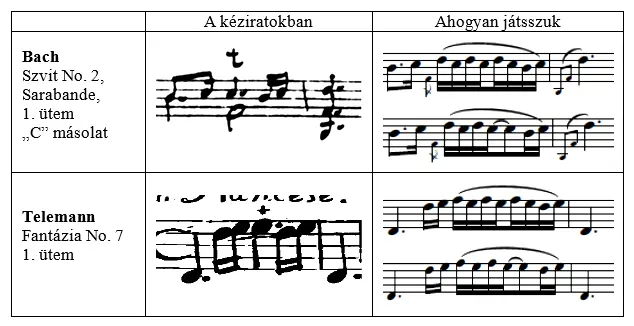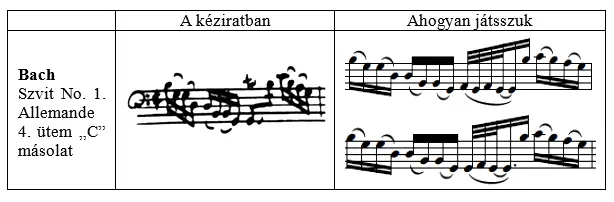 A díszítések jelölése és játékmódja azonban korántsem olyan egyértelmű. Bach Csellószvitjeinek kézírásos másolataiban például a C és D jóval többször jelöl díszítést, mint a két korábbi másolat (A és B), viszont egyik sem az 1. ábra szerint meghatározott módon teszi ezeket (többnyire csak tr jelöléssel találkozunk, amely nem is szerepel a fenti ábrán). Ebből igazoltnak tekinthetjük Donington (1978) korábban idézett meglátását, amely szerint mégis egyfajta díszítő alapképletre utal a sokszor különböző módon jelölt díszítés. Ennek ellenkezője is igaz, amelyre jó példával szolgálnak Telemann kizárólag + -el jelölt díszítései. Ebben az esetben az előadó úgy értelmez helyesen, ha +-el jelzett helyeken több lehetséges, így egymástól eltérő díszítő alapképlet használatát alkalmazza.
