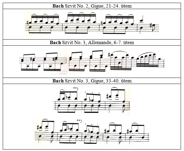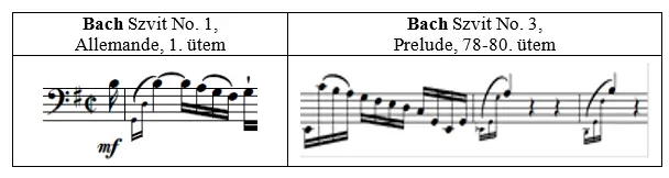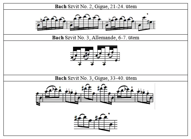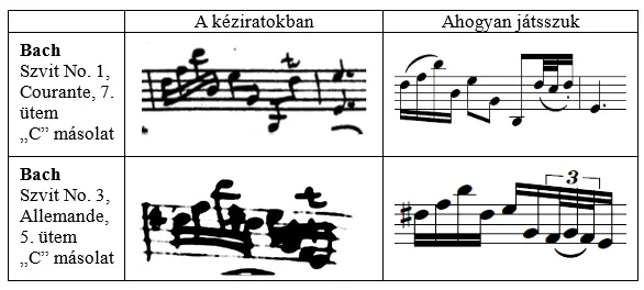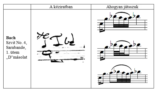 Az artikuláció témakörét vizsgálva a kéziratos forrásokkal kapcsolatban is felmerülnek nehézségek: pl. Bach Szvitjeiben a kötőívezés vagy a staccato-jelölések nem egyeznek egyik másolatban sem, és néhol következetlenek, pontatlanok, vagy egyszerűen csak nehezen kiolvashatók. Ebben az esetben a tisztázás érdekében összevetettem az urtext-kiadások kötőívezését és staccato-jeleit. Ha a hangszerszerűség miatt az eredetitől eltérő kötőívet láttam szükségesnek, akkor a megfelelő helyeken a korábbiakban említett Fuchs által leírt rendezőelveket tartottam szem előtt. Az így keletkezett artikulációs figurákat a kor gyakorlatának megfelelően egy-egy tételben végig megtartottam: