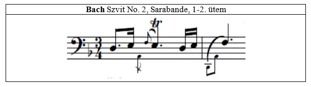 Előfordul olyan hely is, ahol az akkordok helyett alkalmazhatunk az eredetitől eltérő ritmusú zenei figurát. A Csellószvitek D forrása a 2. Szvit záró ütemeiben a pontozott fél értékű akkordokat tizenhatod értékekkel húzza át. Ezzel kapcsolatban Leisinger (2000) is megemlíti, hogy játszhatunk tizenhatod menetet akkordok helyett, amelynek megvalósítására több lehetőség is kínálkozik. A csellista közreadók javaslatai közül a Banda Ede (1993) által közreadott variációt találtam a legötletesebbnek, amely kismértékű kötőív-módosítással fagottszerű is egyben.