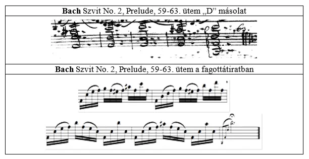 Az általam megvizsgált kiadások – amelyek közül kulcsfontosságú Arthur Weisberg fagottművész 2011-ben megjelent, Bach Szvitjeit közlő fagottátirata – tapasztalatai a következők: bizonyos játékmódbeli kérdések a kiadásokhoz fűzött kommentárok alapján tisztázhatók, azonban ha csupán a kottakép alapján szeretnénk tájékozódni, nem feltétlenül következtethető ki az átírók által írásban javasolt megoldás (itt elsősorban a megfelelő díszítés kiválasztása és játékmódja, illetve Bach esetében az akkordok lehetséges játékmódja emelhető ki). Véleményem szerint nemcsak a kiadáshoz fűzött magyarázatban célszerű utalni az elképzelt játékmódra, hanem érdemes, amennyire csak lehet, egyértelművé tenni mindezt magában a lejegyzésben is, hiszen ez egyben az előadó dolgát is megkönnyíti, és az átirat következetességét is nyomon követhetővé teszi. Természetesen az előadói szabadság jegyében – amely mellett a korabeli kéziratok értelmezése kapcsán Donington (1978) is erőteljesen érvel – el szabad térni a lejegyzéstől, de fontosnak tartom, hogy egy-egy átirat követhető legyen az előadó számára, hiszen annak logikáját megértve válik lehetővé az egyénenként kismértékben eltérő saját verzió kidolgozása. Az átírók minden igyekezetét és jó szándékát tiszteletben tartva azonban meg kell jegyeznem, hogy az előbb említett következetesség csak ritkán, vagy egyáltalán nincs jelen a kottaképben. Ezen túlmenően megállapítható az is, hogy a játékmódot illetően ezek az átiratok helyenként stílusidegen megoldásokat is tartalmaznak, amelyek miatt meglehetősen szubjektív verzióknak tekinthetők. Mindezek továbbgondolását, illetve letisztázását egy saját átirat elkészítésében láttam, amelynek alapjául csakis a korabeli források szolgálhatnak.