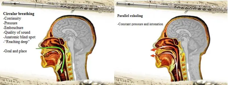 The use of both circular breathing and parallel exhaling solves the problem of missing or unused and remaining air, provides repeated ventilation for the whole body, and results in a calm and unconcerned state of mind due to fresh oxygen. Furthermore, employing the technique enables the synchronisation and adaptation of the body to the structure of the musical piece as well as a comfortable, enjoyable, and balanced sense.