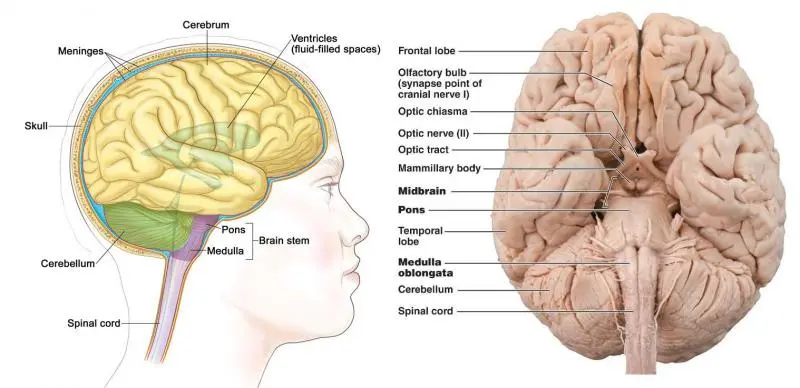 Figure 2: The structure of the central nervous system (lateral view of the head and neck region, the brain, and the spinal cord); inferior view of the brain with cranial nerves and the initial section of the spinal cord