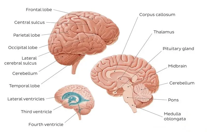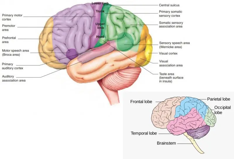 Brain areas do not operate distinctly; instead, they communicate with each other through a complex network of nerve tracts. However, certain parts of the cerebral cortex (frontal lobe, parietal lobe, temporal lobe, occipital lobe), which are separated by gyri, each have a distinct function (motor function, sensory function, hearing, speech, speech recognition, sight).