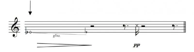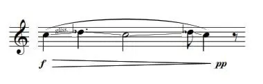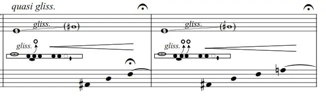 The desired effect can be achieved by turning the instrument in the same manner as with micro-tones. However, gliding between large intervals requires the fingers to slide along the keys. This requires moving the hands in a way whereby the keys are opened and closed gradually (that is, not resembling gears). Ideally, the fingers should be a couple of holes ahead of the end of each section, gradually opening or closing multiple apertures at the same time, depending on the direction of the slide. Producing an uninterrupted glide requires an open-hole flute almost invariably (Ittzés, 2004). (Example: Zoltán Gyöngyössy: Pearls – Hommage à Barnabás Dukay.)