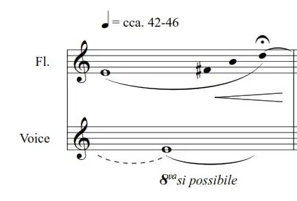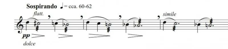 Whereas previously it was the performer’s responsibility to decide whether to use vibrato or not, which could reflect the artist’s personality directly and contribute to a deeper understanding of the performance, nowadays composers tend to prescribe it. In his sonata for solo flute, Barnabás Dukay even attempts a more precise notation which reflects the pace and amplitude of the vibrato; in addition, he also employs the notation senza vibrato multiple times.