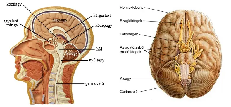 2. ábra: A központi idegrendszer részei (a fej-nyak régió és az agy- valamint a gerincvelő keresztmetszeti képén); az agy alulnézetből a gerincvelő kezdeti részével és az agyidegekkel